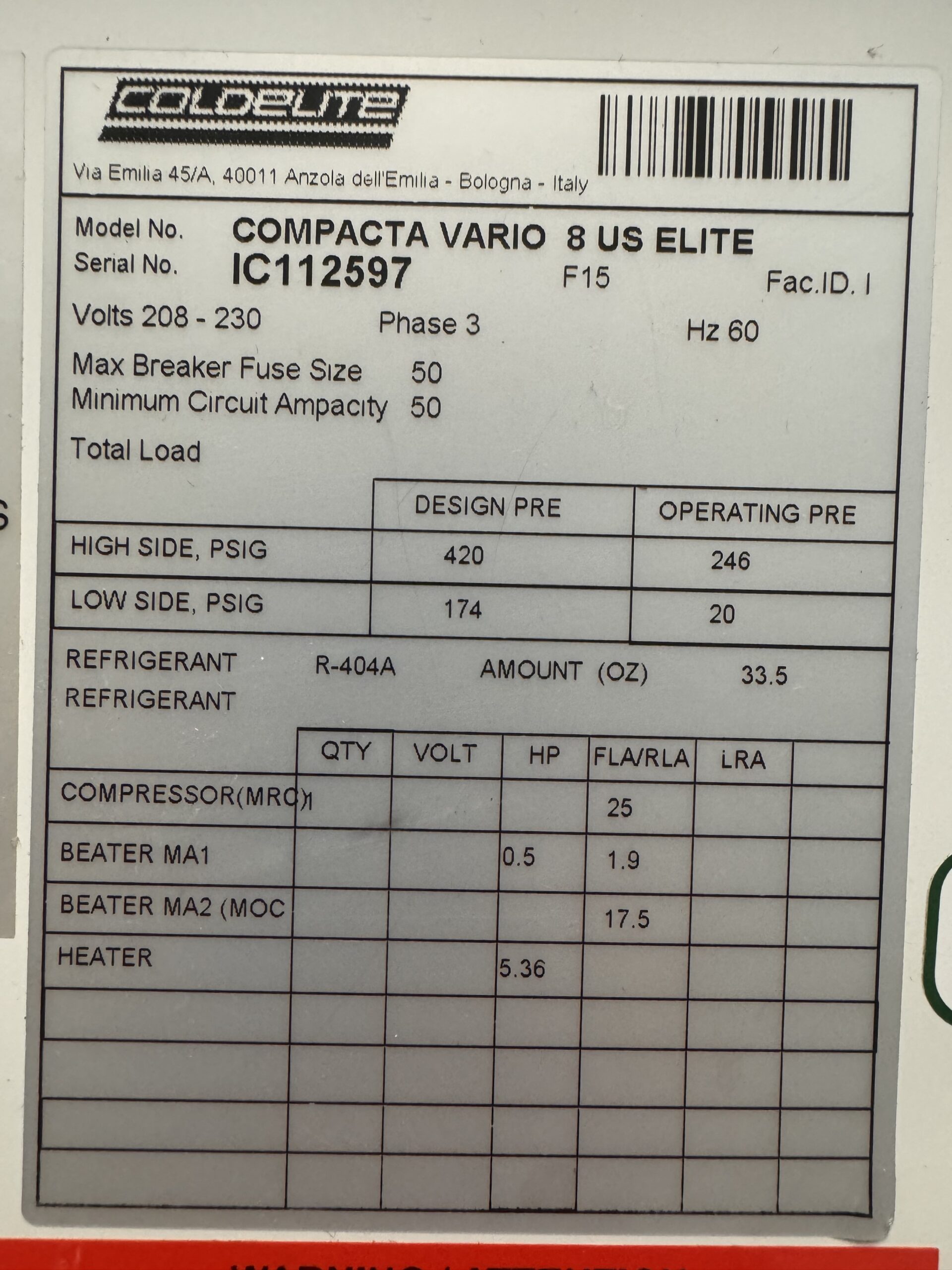 Esta unidad refrigerada por agua requiere una conexión eléctrica trifásica de 208-230 V para su funcionamiento.