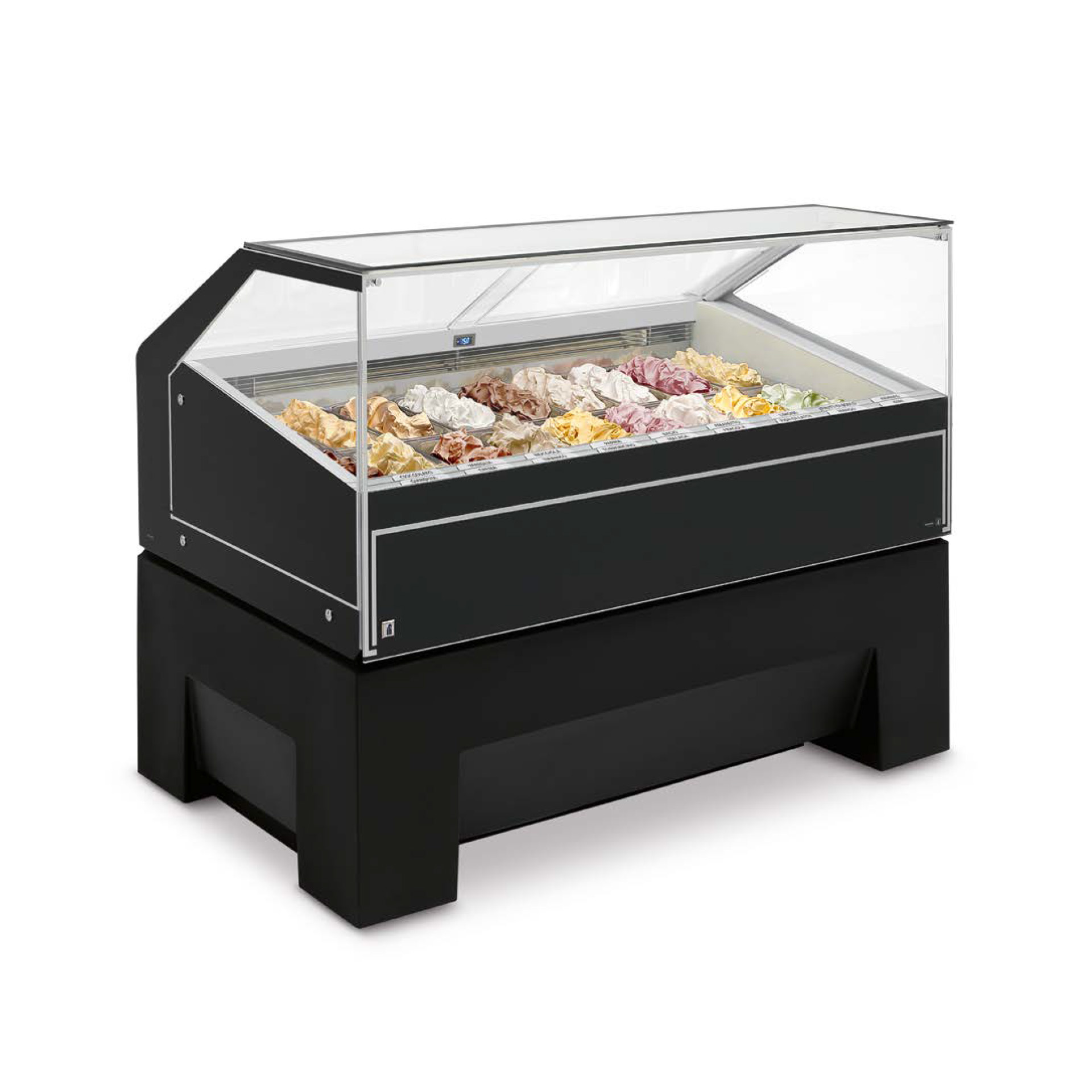 El marco de vidrio autoportante de Jolly, con su máxima transparencia y aislamiento térmico, realza la presentación del gelato, asegurando una visibilidad clara sin condensación y manteniendo el frío dentro de la vitrina. Con puertas correderas de metacrilato claro y sellos semiherméticos, se minimiza la entrada de aire externo.