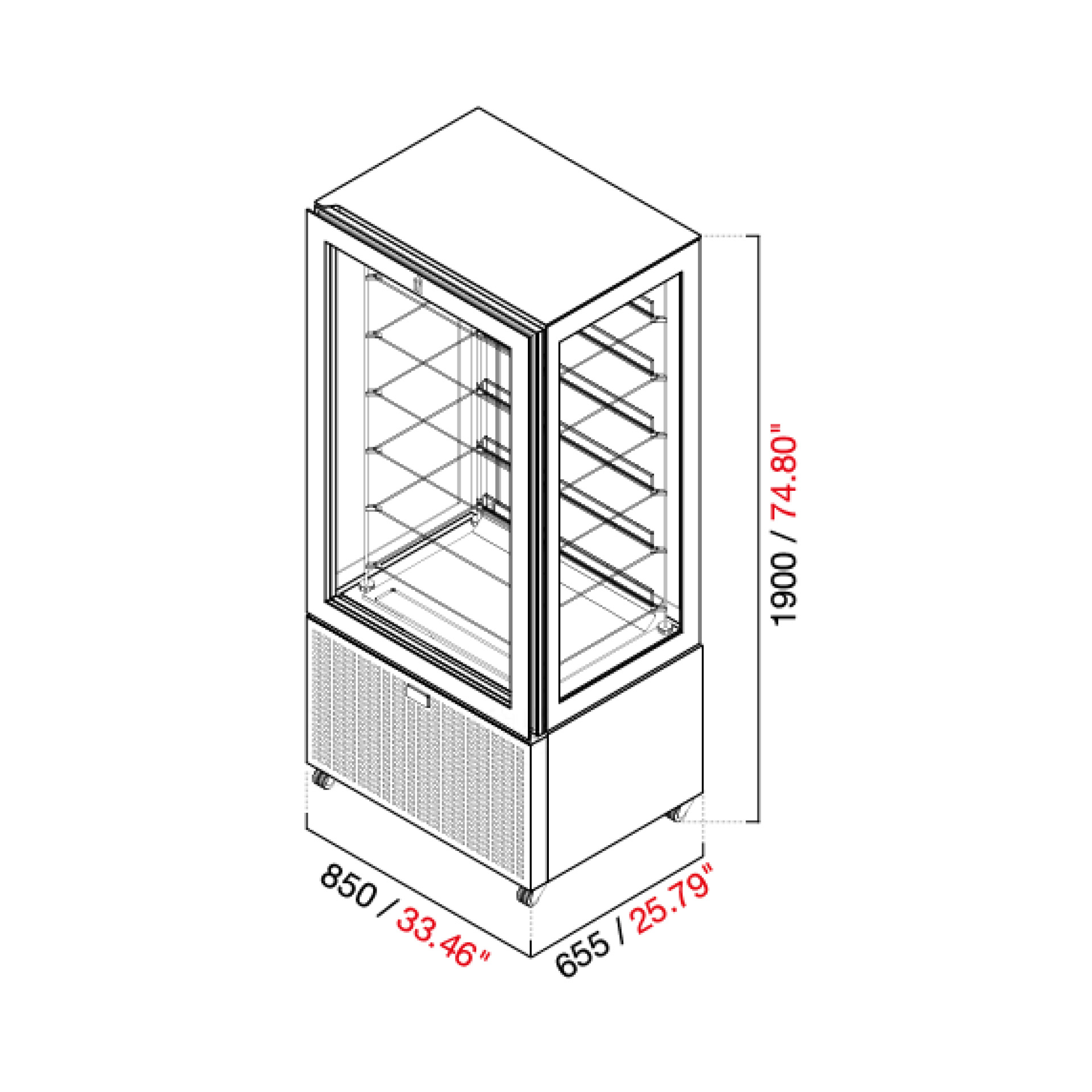 La vitrina opera con una alimentación de Ph/V/Hz 208-220/1/60, asegurando una operación consistente y confiable. Los 4 ruedas giratorias facilitan su movilidad, permitiendo reposicionar la vitrina con facilidad y sin interrumpir tu servicio.