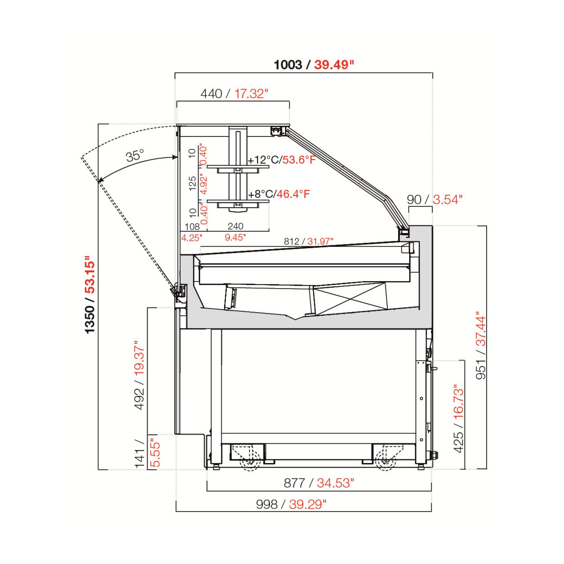 Con una longitud de 44.53″ y una altura de vidrio de 53.15″, esta vitrina proporciona una vista clara y atractiva de los productos, mientras mantiene los postres en condiciones ideales con una temperatura de funcionamiento en el estante superior de +53.6°F y en el inferior de +46.4°F.